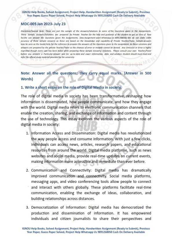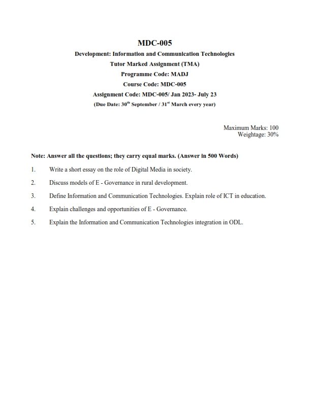 Are you a student of IGNOU looking for high-quality IGNOU MDC-005 Solved Assignment July 2023 English Medium? Look no further than our IGNOU Solved Assign ment PDF Our digital product provides you with the most comprehensive and reliable IGNOU solved assignments, complete with detailed solutions and step-by-step explanations. Our team of experts has years of experience and in-depth knowledge of IGNOU’s curriculum, ensuring that our solved assignments meet the highest standards of quality and accuracy. With our IGNOU Solved Assignment PDF product, you can rest assured that you’re getting the best possible help with your coursework. Our solved assignments cover a wide range of subjects and courses, and are designed to help you master the material and succeed in your studies.